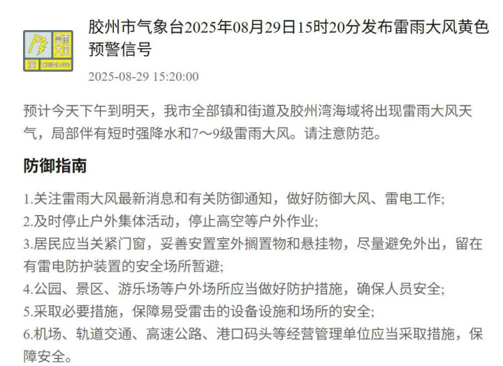 齐鲁网·闪电新闻8月29日讯青岛胶州市气象台2025年8月29日15时20分发布雷雨大风黄色预警信号。